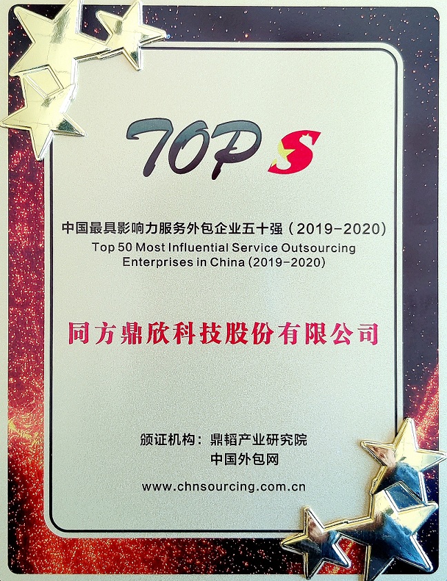 今年3月起, “中國最具影響力服務(wù)外包企業(yè)五十強(qiáng)(2019-2020)”評選活動正式啟動。榜單旨在發(fā)掘中國領(lǐng)軍服務(wù)外包企業(yè)積極探索產(chǎn)業(yè)變革與業(yè)務(wù)增長模式、緊抓發(fā)展機(jī)遇與未來方向的戰(zhàn)略部署能力。通過對服務(wù)外包企業(yè)綜合實力的多維度多方面考量,評選出行業(yè)內(nèi)最優(yōu)質(zhì)、最具示范性的企業(yè)代表。同方鼎欣連續(xù)第三年榮登“中國最具影響力服務(wù)外包企業(yè)五十強(qiáng)”,正是公司近年來把握科技和市場發(fā)展機(jī)遇,革新業(yè)務(wù)模式、加大創(chuàng)新投入、優(yōu)化企業(yè)和項目管理取得的顯著成效。