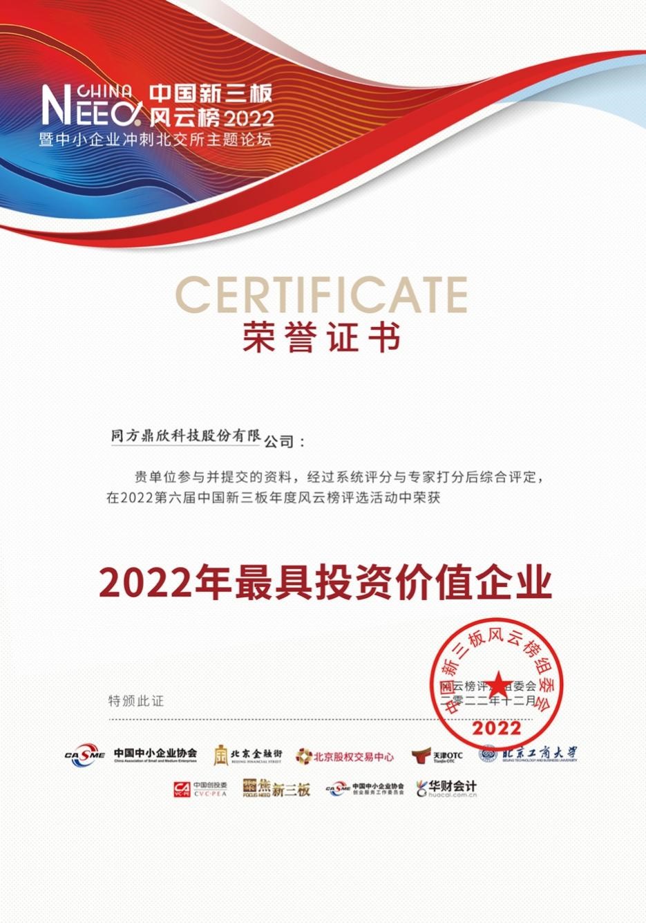 近日,“第六屆中國(guó)新三板年度風(fēng)云榜2022暨中小企業(yè)沖刺北交所主題論壇”成功在京舉辦。會(huì)上公布了2022新三板風(fēng)云榜及北交所投資者保護(hù)指數(shù)評(píng)選優(yōu)秀榜單,同方鼎欣科技股份有限公司(證券簡(jiǎn)稱:鼎欣科技,證券代碼:870840)作為新三板知名企業(yè),在此次活動(dòng)中獲評(píng)十大“最具投資價(jià)值企業(yè)“之一。同時(shí),公司黨支部書記、總裁李建軍先生與公司副總裁、財(cái)務(wù)負(fù)責(zé)人、董事會(huì)秘書郭明星女士分別榮得“新三板優(yōu)秀企業(yè)家”與“新三板企業(yè)金牌董秘”倆大個(gè)人獎(jiǎng)項(xiàng)。