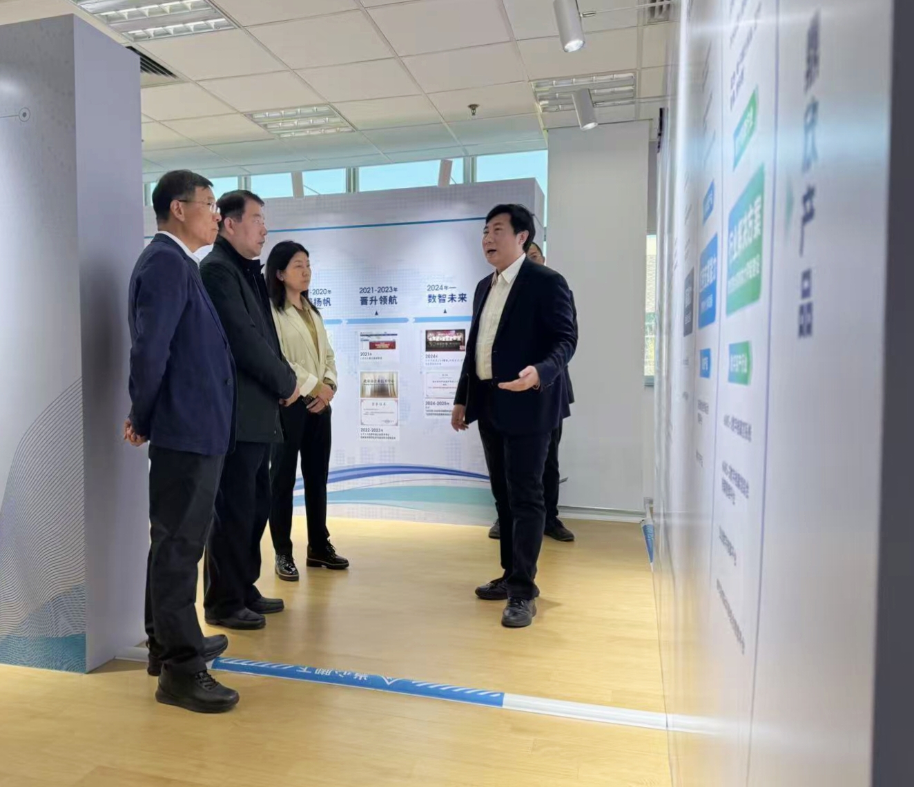 調(diào)研伊始,黃書記一行首先參觀了鼎欣科技的企業(yè)展廳,深入了解了公司的發(fā)展歷程、行業(yè)客戶版圖及核心技術(shù)成果。隨后的會議交流中,鼎欣科技董事長郭總詳細(xì)介紹了鼎欣的整體情況與近年來的創(chuàng)新發(fā)展成果。在創(chuàng)新層面,公司多款智能體案例憑借突出的技術(shù)創(chuàng)新性與實踐價值首批入選重要創(chuàng)新方案庫,聚焦AI與行業(yè)深度融合的AI+行業(yè)場景方案更屢獲權(quán)威殊榮與賽事獎項,充分彰顯了我司扎實的技術(shù)實力;在行業(yè)應(yīng)用層面,公司立足AI與行業(yè)深度融合打造的AI+行業(yè)場景方案,已在多個核心領(lǐng)域?qū)崿F(xiàn)規(guī)?;涞兀⑸疃葷B透多行業(yè)實際業(yè)務(wù)場景,充分證明了鼎欣科技以AI+行業(yè)場景為核心的創(chuàng)新能力已通過市場檢驗,可為不同行業(yè)客戶精準(zhǔn)創(chuàng)造核心價值。