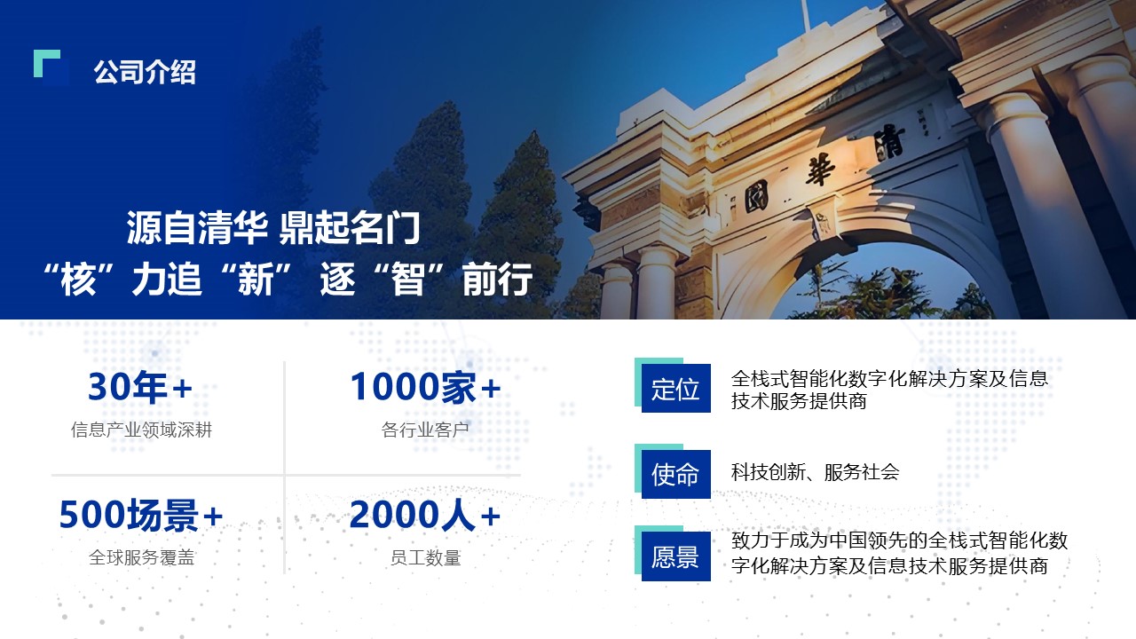 公司企業(yè)文化秉承自清華大學校訓,經凝練后形成“創(chuàng)新、進取、誠正、務實、拼搏、擔當”的經營理念,公司憑借在技術革新、人才儲備以及管理優(yōu)化等多方面的雄厚實力,我司依托人工智能、數(shù)據(jù)資產、運維服務三大核心技術矩陣,構筑起堅實的技術底座。以金融保險、移動通信、醫(yī)療健康、公共服務(數(shù)字鄉(xiāng)村)、智能制造五大戰(zhàn)略領域為錨點,縱向深耕行業(yè)場景需求;橫向以技術創(chuàng)新驅動全鏈路服務,形成技術研發(fā)、場景落地、運維保障三位一體的全維度生態(tài)體系。從底層技術突破到行業(yè)應用實踐,我們以數(shù)字化賦能產業(yè)升級,為各行業(yè)客戶提供量身定制、高效可靠的解決方案和專業(yè)服務,全力推動數(shù)字化技術與實體經濟深度融合。經過多年的積累,公司先后為IBM、慧與中國、通用電氣、伯凱科技、中核集團、國網信息、國家電網、中國石油、中國氣象、中海油、中國電子、中國鐵塔、中國恩菲、中國移動、中國聯(lián)通、中國電信、國家電投等國內外知名企業(yè)成功提供過數(shù)字化解決方案和信息技術服務。