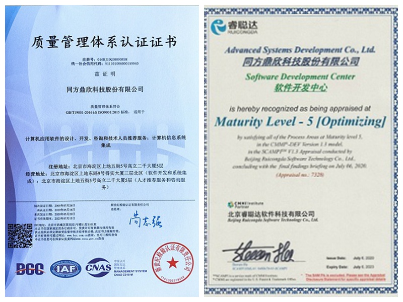 同方鼎欣于1999年通過了CMM L2的評估,是國內(nèi)第一家通過CMM評估的企業(yè),自2005年公司首次獲得ISO9001質量安全認證以來,公司業(yè)務運營遵循著制度化、規(guī)范化、體系化的管理模式。公司圍繞質量、環(huán)境以及職業(yè)健康安全建立了管理制度、操作程序文檔及記錄,嚴格實現(xiàn)了對內(nèi)嚴控質量安全、建立風險管控機制,不斷推進質量標準體系建設,對外以國家標準、行業(yè)標準為核心,確保服務和產(chǎn)品高質量交付,實現(xiàn)穩(wěn)定的可持續(xù)發(fā)展。公司于2020年7月順利通過CMMI 5級評估,并將CMMI5級的各項標準應用到項目管理及應用開發(fā)的各個環(huán)節(jié),一如既往地堅持對產(chǎn)品質量和過程改進的關注,并會將量化管理的思想融入企業(yè)管理和運營中,支持企業(yè)在研發(fā)管理、產(chǎn)品質量和過程能力上的全面提升,不斷革新技術、迭代產(chǎn)品,推出更成熟的解決方案和服務,助力客戶數(shù)字化轉型。